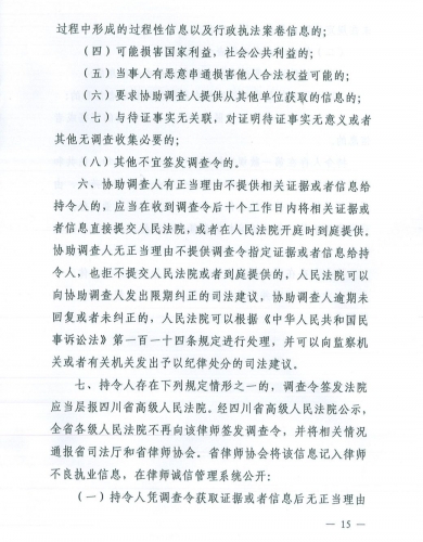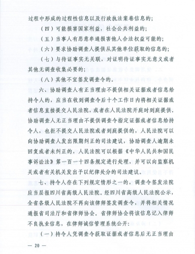 第十八条 持令人存在下列规定情形之一的,调查令签发法院应当层报四川省高级人民法院。经四川省高级人民法院公示,全省各级人民法院不再向该律师签发调查令,并将相关情况通报省司法厅和省律师协会。省律师协会将该信息记入律师不良执业信息,在律师诚信管理系统公开: