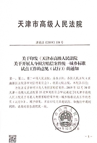 天津市高级人民法院《关于开展人身损害赔偿案件统一城乡标准试点工作的意见(试行)》.jpg