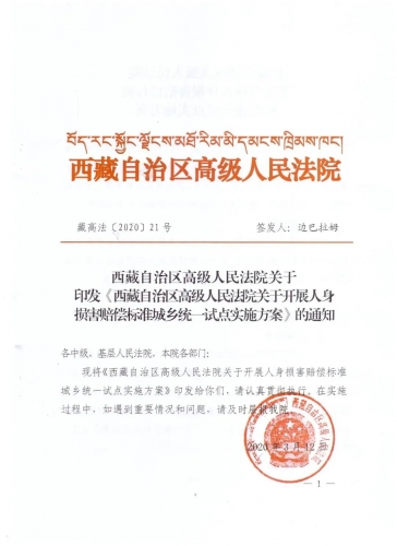 西藏自治区高级人民法院关于印发《西藏自治区高级人民法院关于开展人身 损害赔偿标准城乡统一试点实施方案》的通知