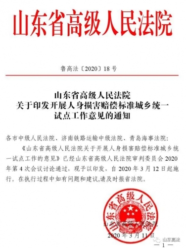 山东省高级人民法院关于开展人身损害赔偿标准城乡统一试点工作的意见