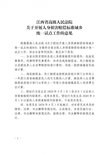 《江西省高级人民法院关于开展人身损害赔偿标准城乡统一试点工作的意见》已经江西省高级人民法院审判委员会2020年第1次会议讨论通过,现予以印发,自2020年4月1日起施行。试点过程中如遇重大情况和问题,请及时层报省法院立案二庭。
