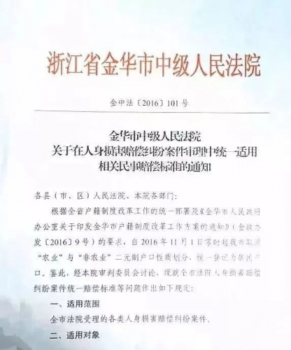 根据全省户籍制度改革工作的统一部署及《金华市人民政府办公室关于印发金华市户籍制度改革工作方案的通知》(金政办发【2016】9号)的要求,自2016年11月1日零时起我市取消“农业”与“非农业”二元制户口性质划分,统一登记为居民户口。鉴此,经本院审判委员会讨论,现就全市法院人身损害赔偿纠纷案件统一赔偿标准等问题作出如下规定: