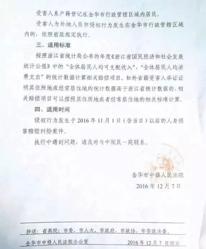 浙江省金华市中级人民法院关于在机动车交通事故责任纠纷案件审理中统一适用相关民事赔偿标准的通知