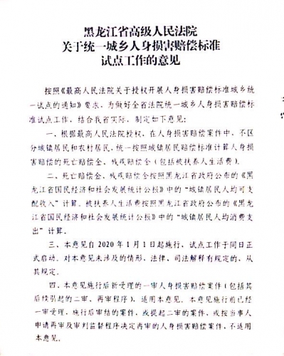 黑龙江省高级人民法院《关于统一城乡人身损害赔偿标准试点工作的意见》的通知.jpg (81.96 KB, 下载次数: 690)