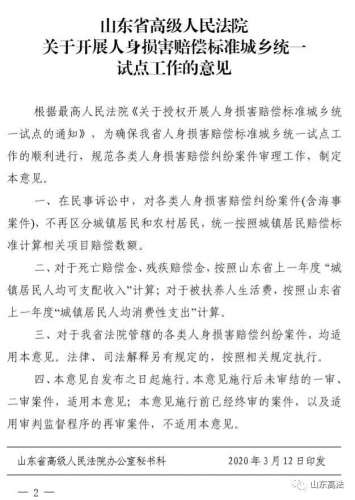 山东省高级人民法院关于开展人身损害赔偿标准城乡统一试点工作的意见