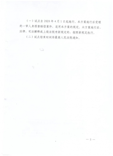 (一)试点自2020年4月1日起施行。本方案施行后受理的一审人身损害赔偿案件,适用本方案的规定。本方案施行后,法律、司法解释或上级法院有新规定的,按照新规定执行。