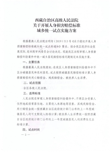 西藏自治区高级人民法院关于开展人身损害赔偿标准城乡统一试点实施方案