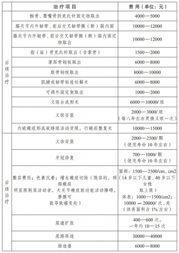 8.3.7必然发生的后续治疗费的评定,原则上需按照下表中标准执行(见附表);对于标准中未列出的,可比照相近治疗费用标准进行评估。