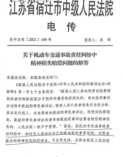 江苏省宿迁市中级人民法院关于机动车交通事故责任纠纷中精神损失赔偿问题的解答