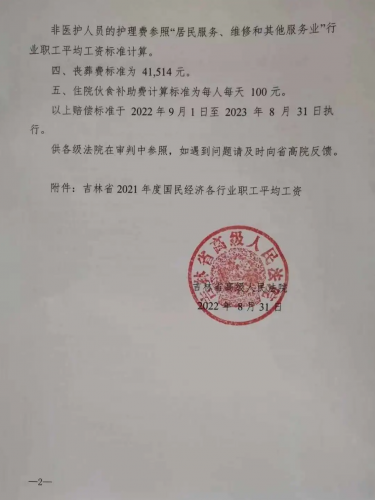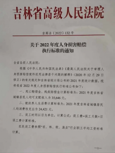 吉林省高级人民法院关于2022年度人身损害赔偿执行标准的通知