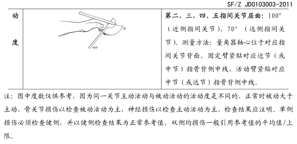4.10.7 关节功能障碍:对于骨与关节损伤所致的关节功能障碍,测量关节的被动活动度;对于肌腱、周围神经损伤所致的关节功能障碍,测量关节的主动活动度。具体方法见附录 A.1。测量