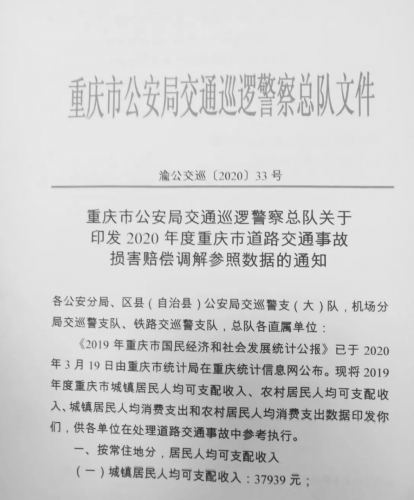 重庆市公安局交通巡逻警察总队关于印发2020年度重庆市道路交通事故损害赔偿调解参照数.png (484.67 KB, 下载次数: 802)