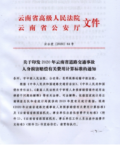云南省高院、省公安厅《关于印发2020年云南省道路交通事故人身损害赔偿有关费用计算标准的通知》