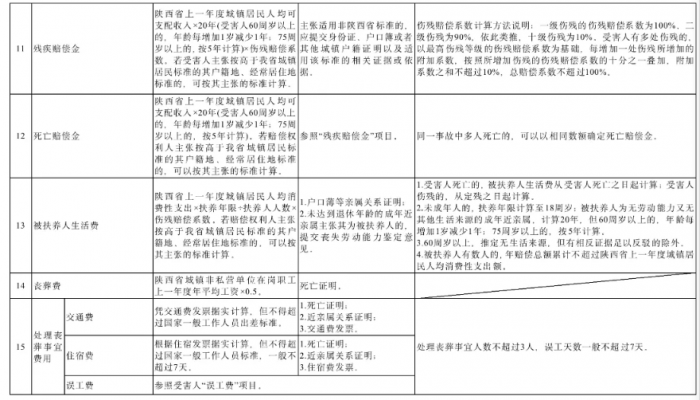 | | 陕西省上一年度城镇居民人均消费性支出×扶养年限÷扶养人人数×伤残赔偿系数。若赔偿权利人主张按高于我省城镇居民标准的其户籍地、经常居住地标准的,可以按其主张的标准计算。 | 1.户口薄等亲属关系证明; 2.未达到退休年龄的成年近亲属主张其为被扶养人的,提交丧失劳动能力鉴定意见。 | 1.受害人死亡的,被扶养人生活费从受害人死亡之日起计算;受害人伤残的,从定残之日起计算。 2.未成年人的,扶养年限计算至18周岁;被扶养人为无劳动能力又无其他生活来源的成年近亲属,计算20年,但60周岁以上的,年龄每增加1岁减少1年;75周岁以上的,按5年计算。 3.60周岁以上,推定无生活来源,但有相反证据足以反驳的除外。 4.被扶养人有数人的,年赔偿总额累计不超过陕西省上一年度城镇居民人均消费性支出额。 |