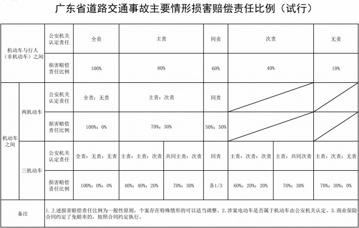 广东省道路交通事故主要情形损害赔偿责任比例(试行)