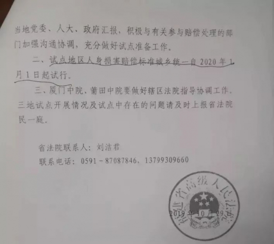 福建省高级人民法院关于在省内部分地区开展人身损害赔偿标准城乡统一试点的通知2.jpg (32.17 KB, 下载次数: 544)