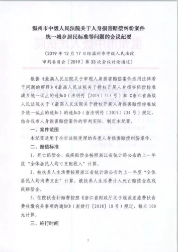浙江省温州市中级人民法院关于人身损害赔偿纠纷案件统一城乡居民标准等问题的会议纪要2.jpg (96.09 KB, 下载次数: 597)