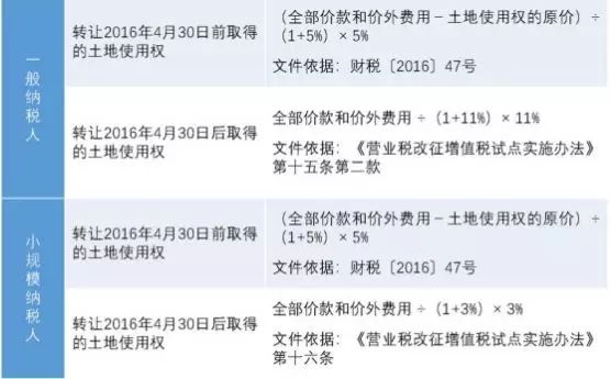 1、增值税。根据《财政部 国家税务总局关于进一步明确全面推开营改增试点有关劳务派遣服务、收费公路通行费抵扣等政策的通知》(财税〔2016〕47号)“三、其他政策(二)纳税人以经营租赁方式将土地出租给他人使用,按照不动产经营租赁服务缴纳增值税。纳税人转让2016年4月30日前取得的土地使用权,可以选择适用简易计税方法,以取得的全部价款和价外费用减去取得该土地使用权的原价后的余额为销售额,按照5%的征收率计算缴纳增值税。”的规定分为如下几种情况。