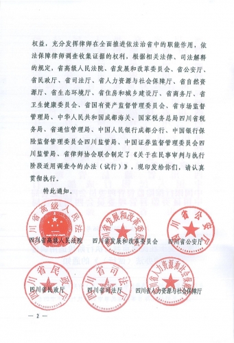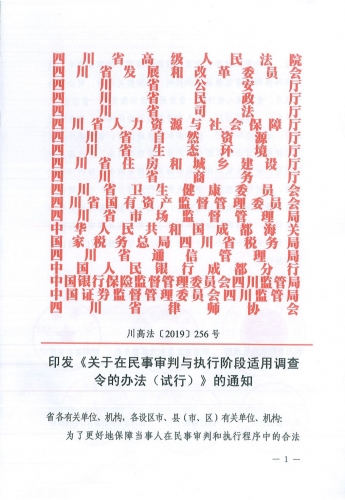 为了更好地保障当事人在民事审判和执行程序中的合法权益,充分发挥律师在全面推进依法治省中的职能作用,依法保障律师调查收集证据的权利,根据相关法律、司法解释的规定,省高级人民法院、省发展和改革委员会、省公安厅、省民政厅、省司法厅、省人力资源与社会保障厅、省自然资源厅、省生态环境厅、省住房和城乡建设厅、省商务厅、省卫生健康委员会、省国有资产监督管理委员会、省市场监督管理局、中华人民共和国成都海关、国家税务总局四川省税务局、省通信管理局、中国人民银行成都分行、中国银行保险监督管理委员会四川监管局、中国证券监督管理委员会四川监管局、省律师协会联合制定了《关于在民事审判与执行阶段适用调查令的办法(试行)》,现印发给你们,请认真贯彻执行。
