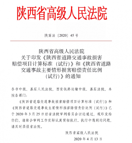 《陕西省道路交通事故损害赔偿项目计算标准(试行)》和《陕西省道路交通事故主要情形损害赔偿责任比例(试行)》已于2020年3月25日经省法院审判委员会讨论通过,现印发给你们,请结合审判工作实际认真贯彻执行。执行中遇到的问题,请及时层报省法院。