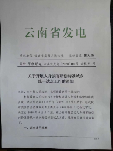 云南省高院《关于开展人身损害赔偿标准城乡统一试点工作的通知》(云高法发电【2020】.jpg (89.79 KB, 下载次数: 573)