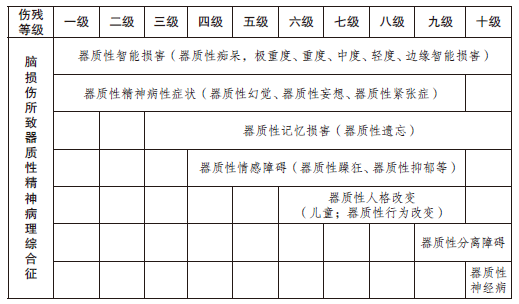 根据《人体损伤致残程度分级》标准评定时,各类器质性精神病理综合征的伤残等级范围可参考下表: