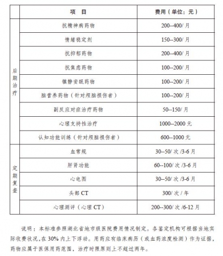 8.3.3 损伤导致的严重精神症状(如冲动、伤人等危害自身及他人的症状)存在医疗依赖者,其后期治疗费的评估应根据精神医学科学规律及可行性原则,一般2年后不再给予病因治疗费用,但应适当考虑给予对症支持及并发症防治的费用。