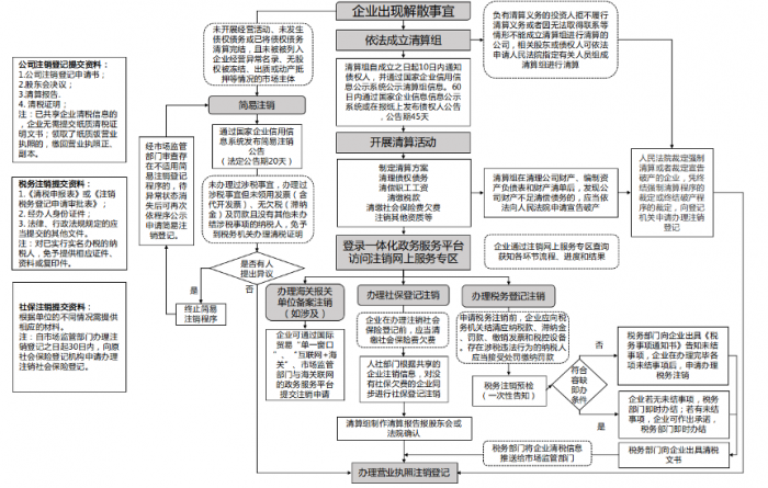 通常情况下,企业终止经营活动退出市场,需要经历决议解散、清算分配和注销登记三个主要过程。以公司为例,按照《公司法》规定,公司在退出市场正式终止前,须依法宣告解散、成立清算组进行清算,清理公司财产、清缴税款、清理债权债务,支付职工工资、社会保险费用等,待公司清算结束后,应制作清算报告并办理注销公司登记,公告公司终止。